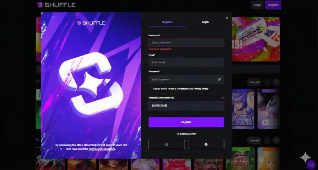 - Enter Code: In the registration form, we entered the Shuffle promo code SMPBONUS in the “Referral Code (Optional)” field. If you forget, you can add it in your profile menu before depositing.
